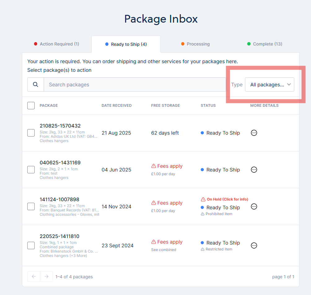Simply click on Type: All packages and from the drop down you can select ‘Ready to Ship’ or ‘Consolidated’.