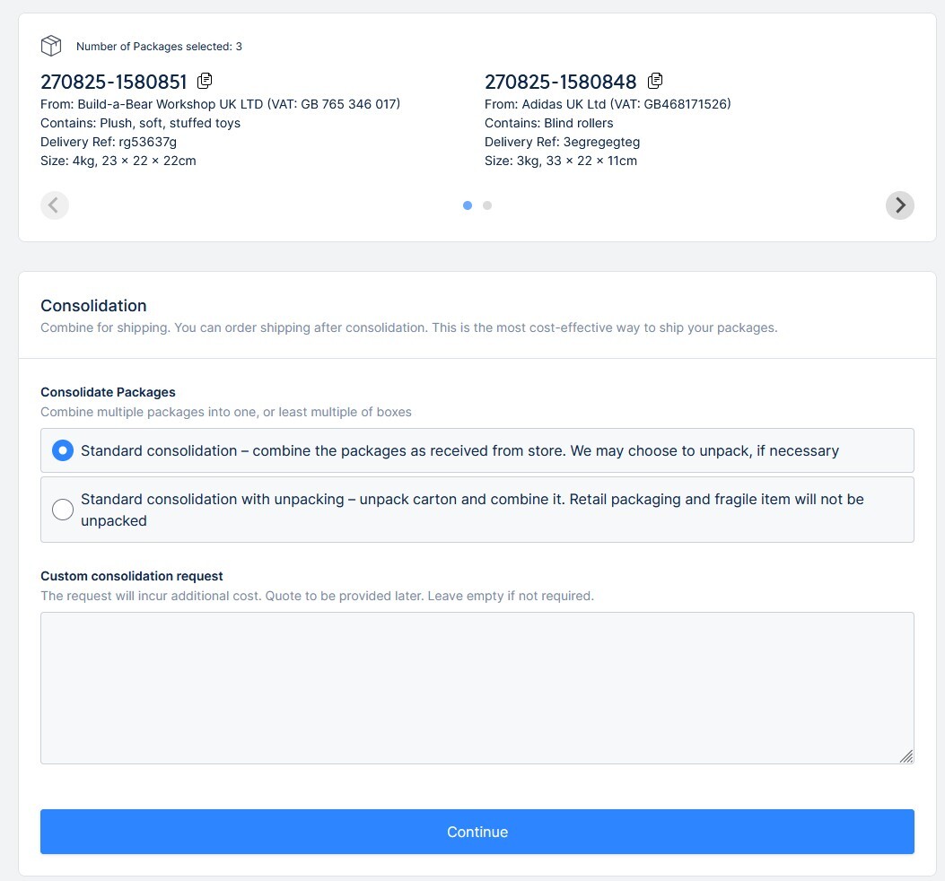 Step 3: Select your consolidation options and click ‘Continue’. You can enter any consolidation request if you want (additional fee applies, optional)