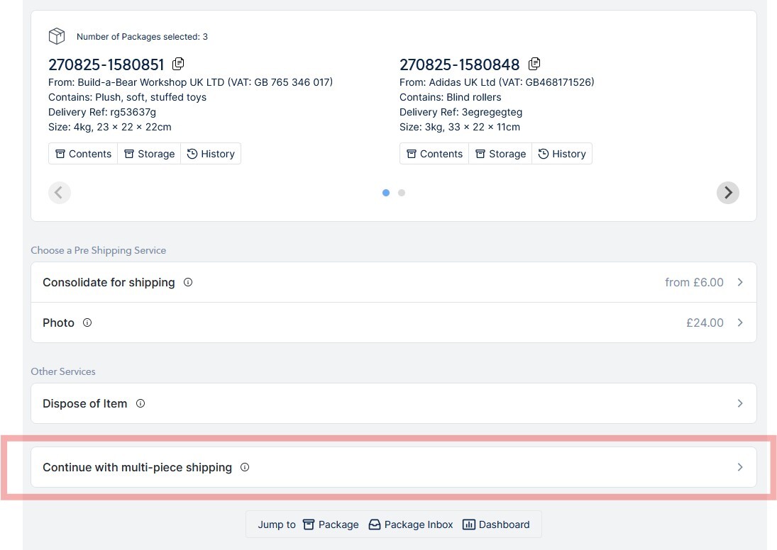 - Multi-piece Shipping (up to 5 packages) — You can order to ship multiple packages (up to 5) in one order using our couriers. This is called multi-piece shipping, where your packages are grouped in one shipment. For more than 5 packages, simply order consolidation, as usual. Once consolidated, you can order international shipping in your account. Multi-piece is not available for Royal Mail.