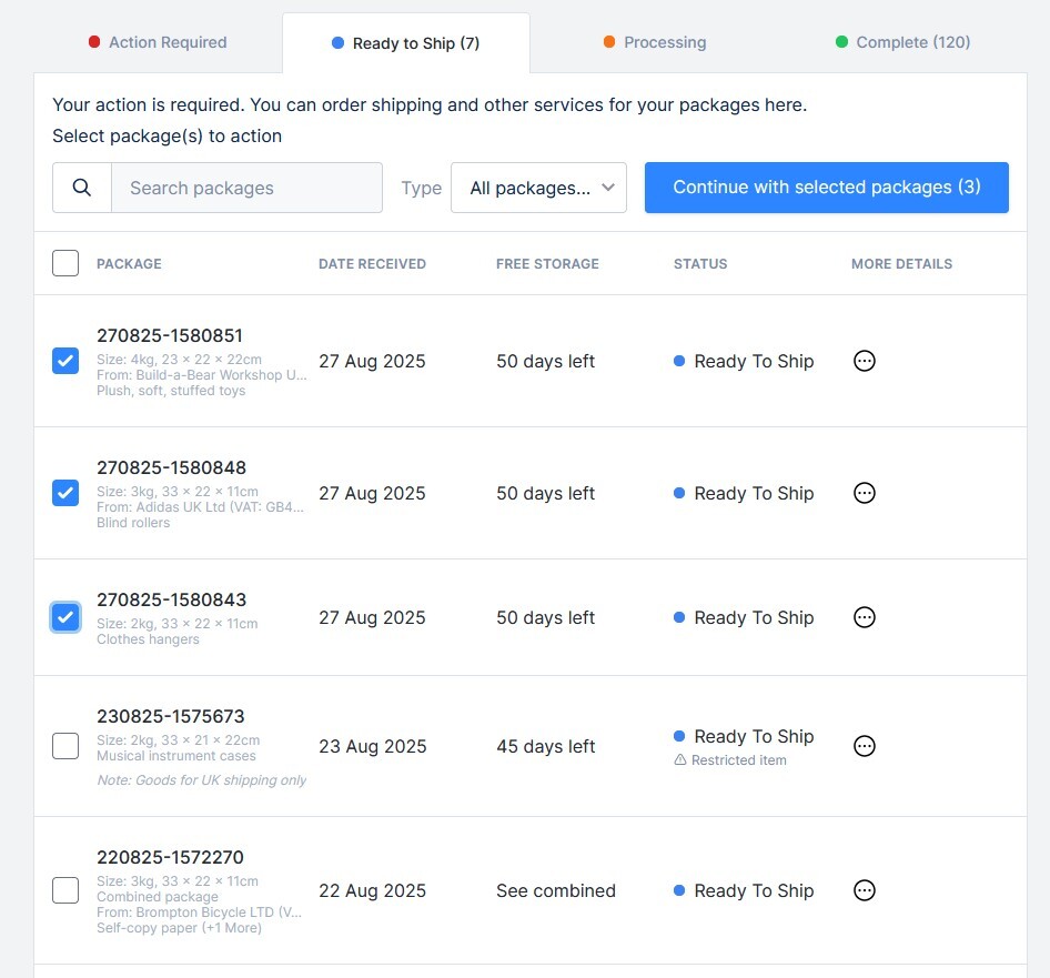 Step 1: Select some or all your packages in your Package Inbox > Ready to Ship and click ‘Continue with selected packages’.